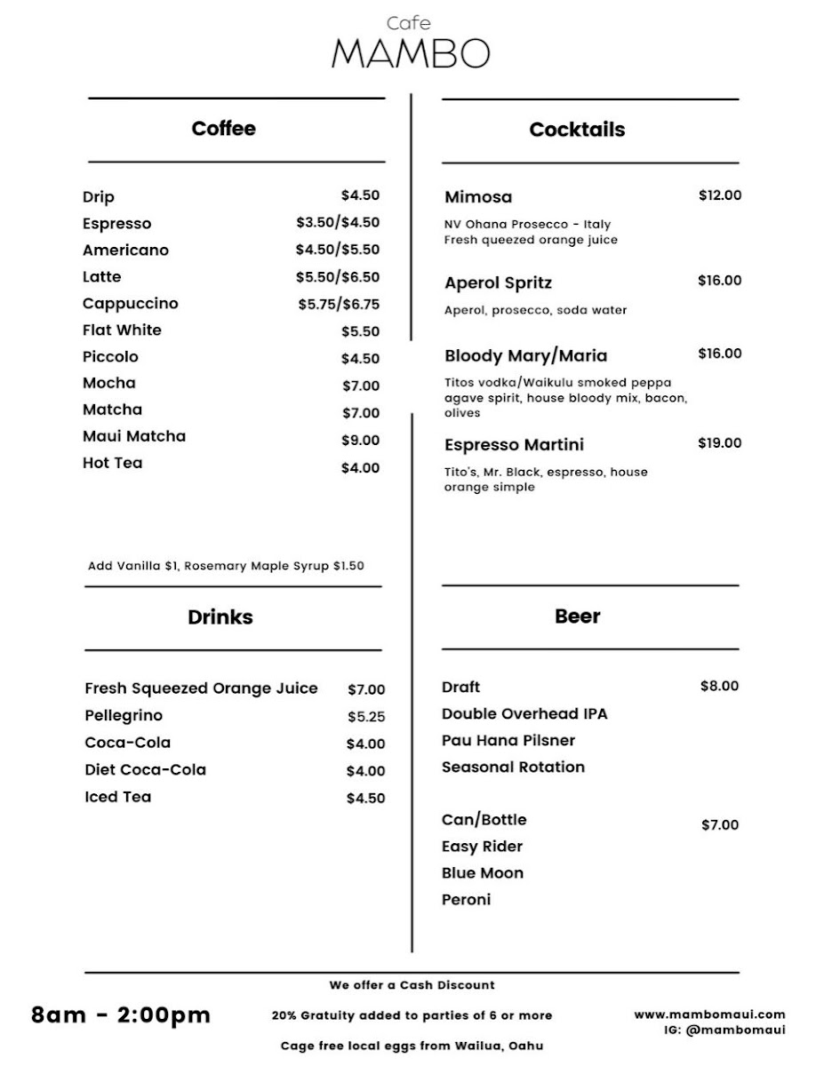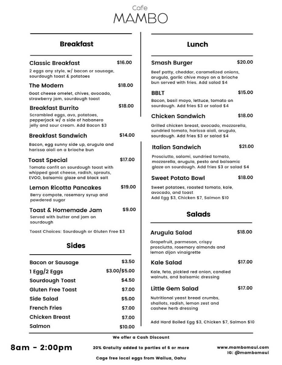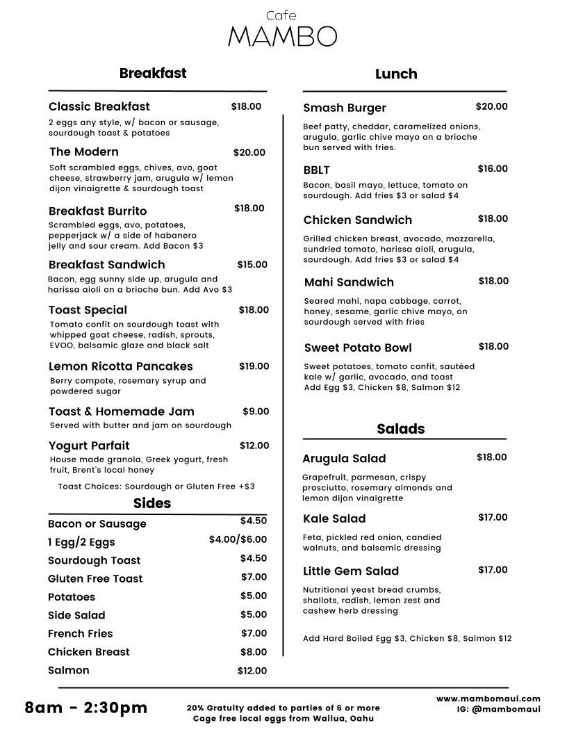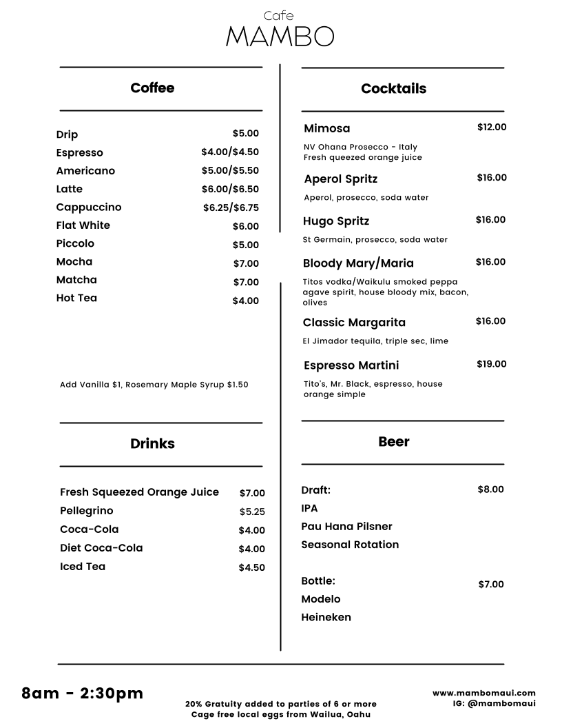 If you're in Paia, HI, and craving a laid-back yet vibrant spot to enjoy a meal, you have to check out the Cafe Mambo Menu. Nestled on Baldwin Avenue, this place offers a blend of mouthwatering dishes with a warm, inviting atmosphere. From delicious breakfast options to flavorful lunch and dinner choices, there's something for everyone here. Whether you're in the mood for a fresh seafood dish, a hearty sandwich, or a refreshing salad, each item is crafted with locally sourced ingredients, making every bite feel like a taste of the island. The casual vibe pairs perfectly with their array of drinks, from refreshing smoothies to tropical cocktails, perfect for enjoying the Hawaiian breeze. Whether you're a local or just passing through, the menu at Cafe Mambo offers a tasty, laid-back dining experience you won’t want to miss.