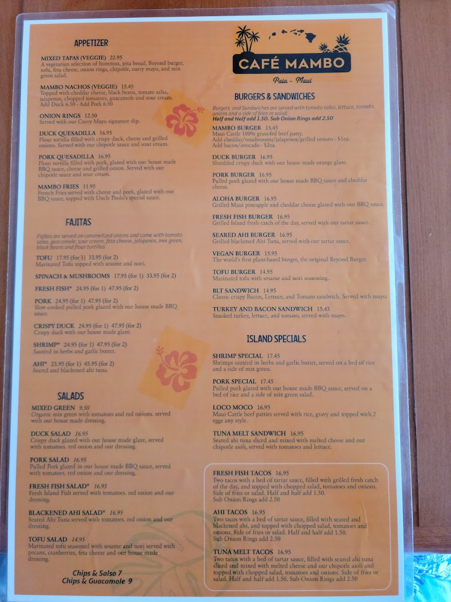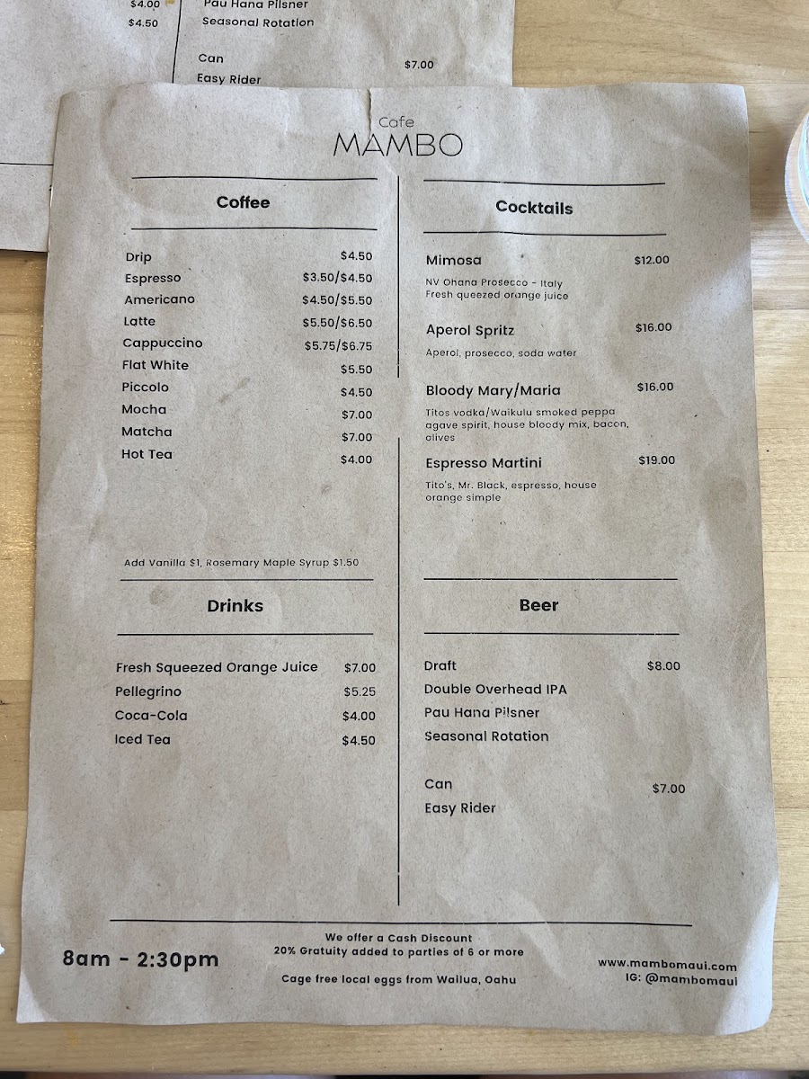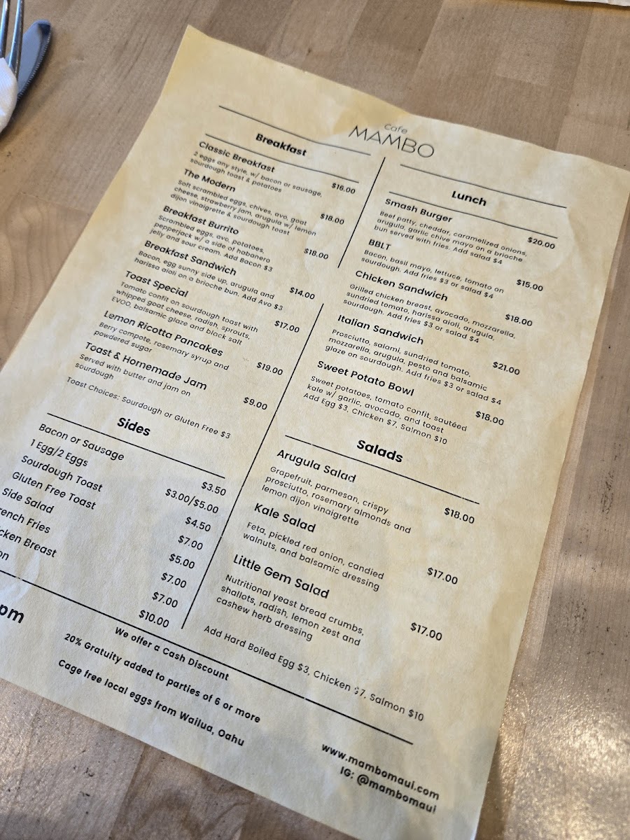 If you're in Paia, HI, and craving a laid-back yet vibrant spot to enjoy a meal, you have to check out the Cafe Mambo Menu. Nestled on Baldwin Avenue, this place offers a blend of mouthwatering dishes with a warm, inviting atmosphere. From delicious breakfast options to flavorful lunch and dinner choices, there's something for everyone here. Whether you're in the mood for a fresh seafood dish, a hearty sandwich, or a refreshing salad, each item is crafted with locally sourced ingredients, making every bite feel like a taste of the island. The casual vibe pairs perfectly with their array of drinks, from refreshing smoothies to tropical cocktails, perfect for enjoying the Hawaiian breeze. Whether you're a local or just passing through, the menu at Cafe Mambo offers a tasty, laid-back dining experience you won’t want to miss.